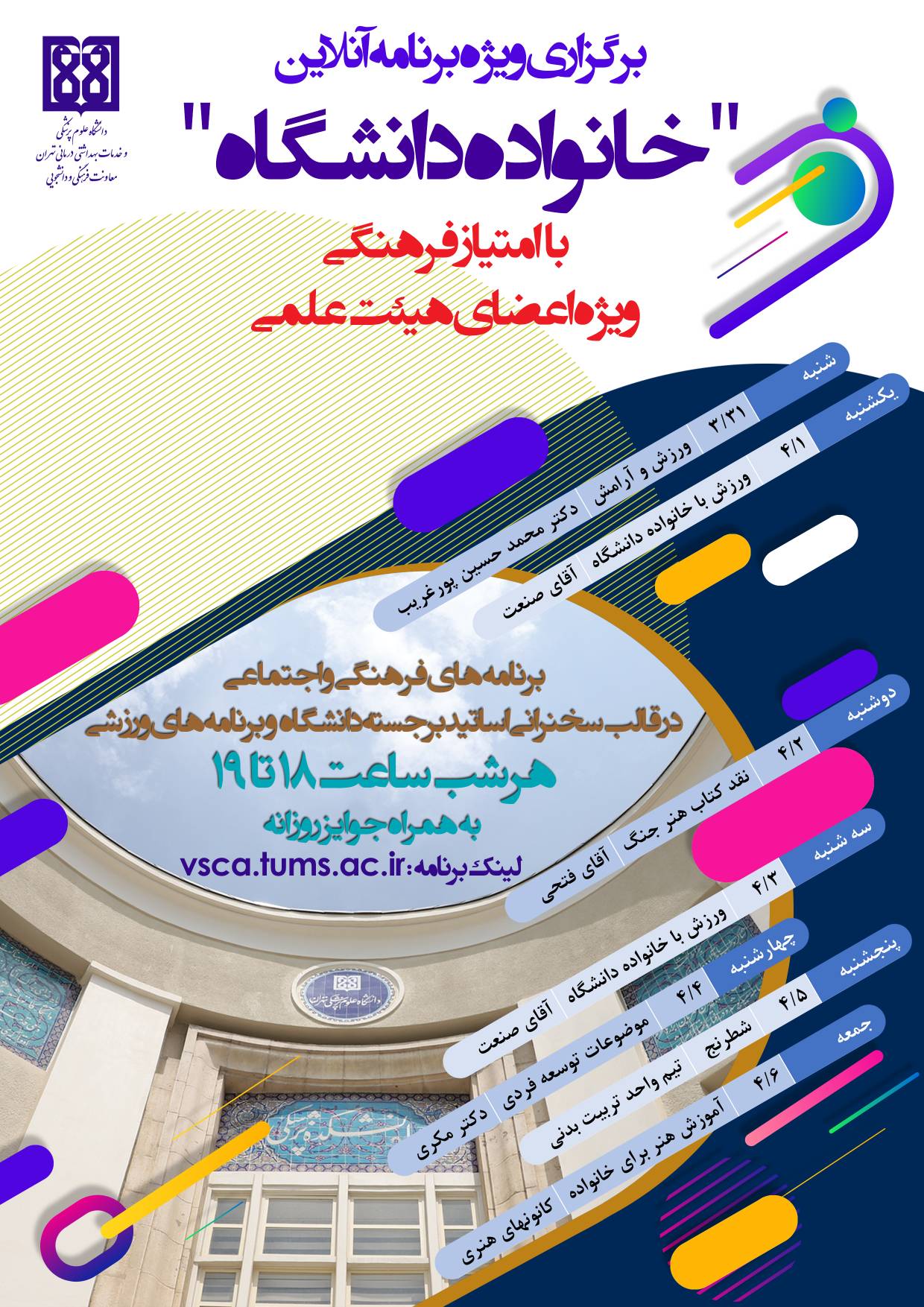 جدول زمانی ویژه برنامه روزانه خانواده دانشگاه به همراه جوایز روزانه با مشارکت دانشجویان، کارکنان و اعضای هیئت علمی دانشگاه علوم پزشکی تهران و خانواده آنها منتشر شد.
