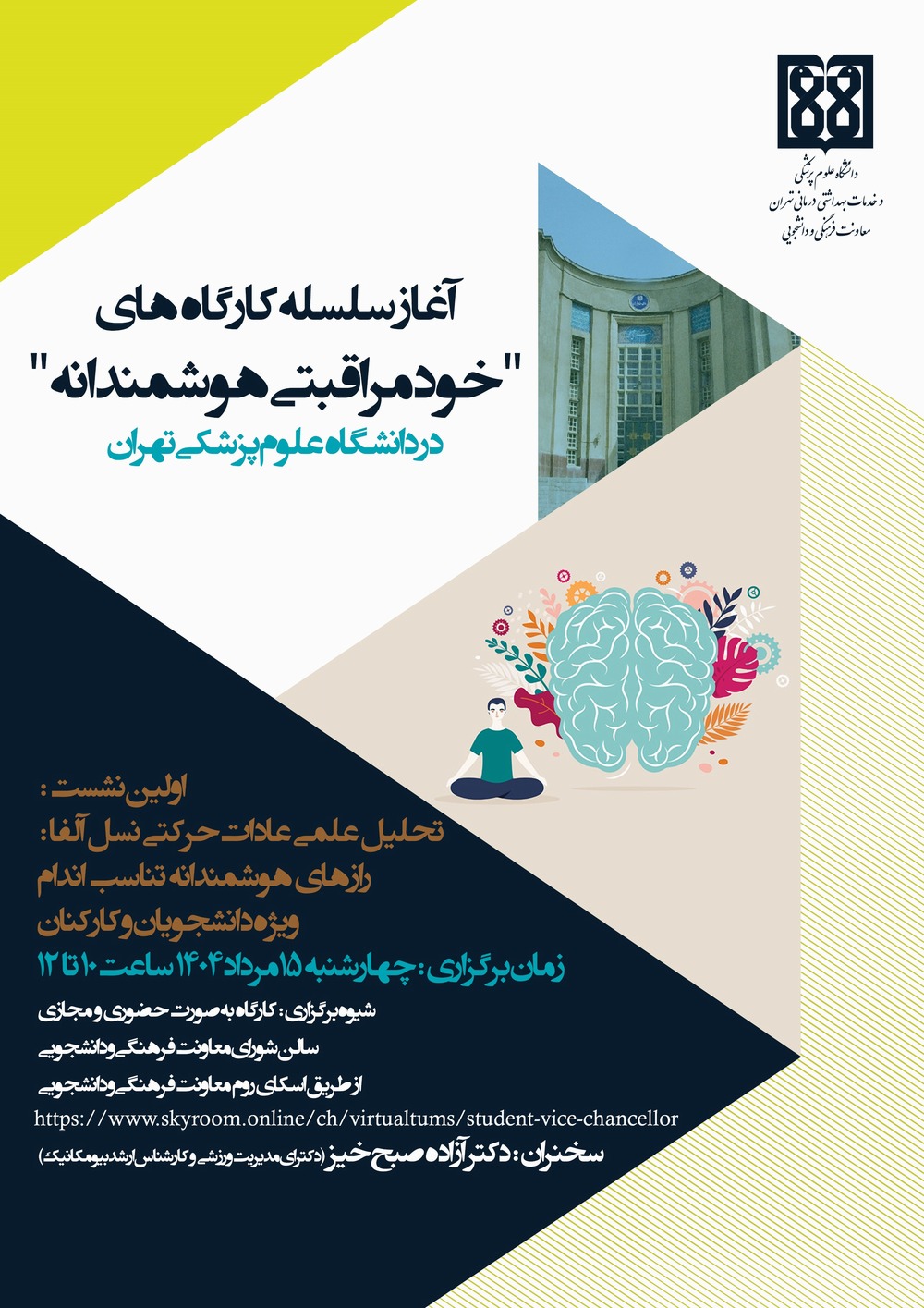 با هدف ارتقا سلامت جسم و روان دانشگاهیان، نخستین نشست از سلسله کارگاه‌های «خودمراقبتی هوشمندانه» دانشگاه علوم پزشکی تهران با محوریت «تحلیل علمی عادات حرکتی نسل آلفا و ارائه راهکارهای نوین تناسب اندام»، ویژه دانشجویان و کارکنان، چهارشنبه ۱۵ مرداد ۱۴۰۴ برگزار می‌شود.