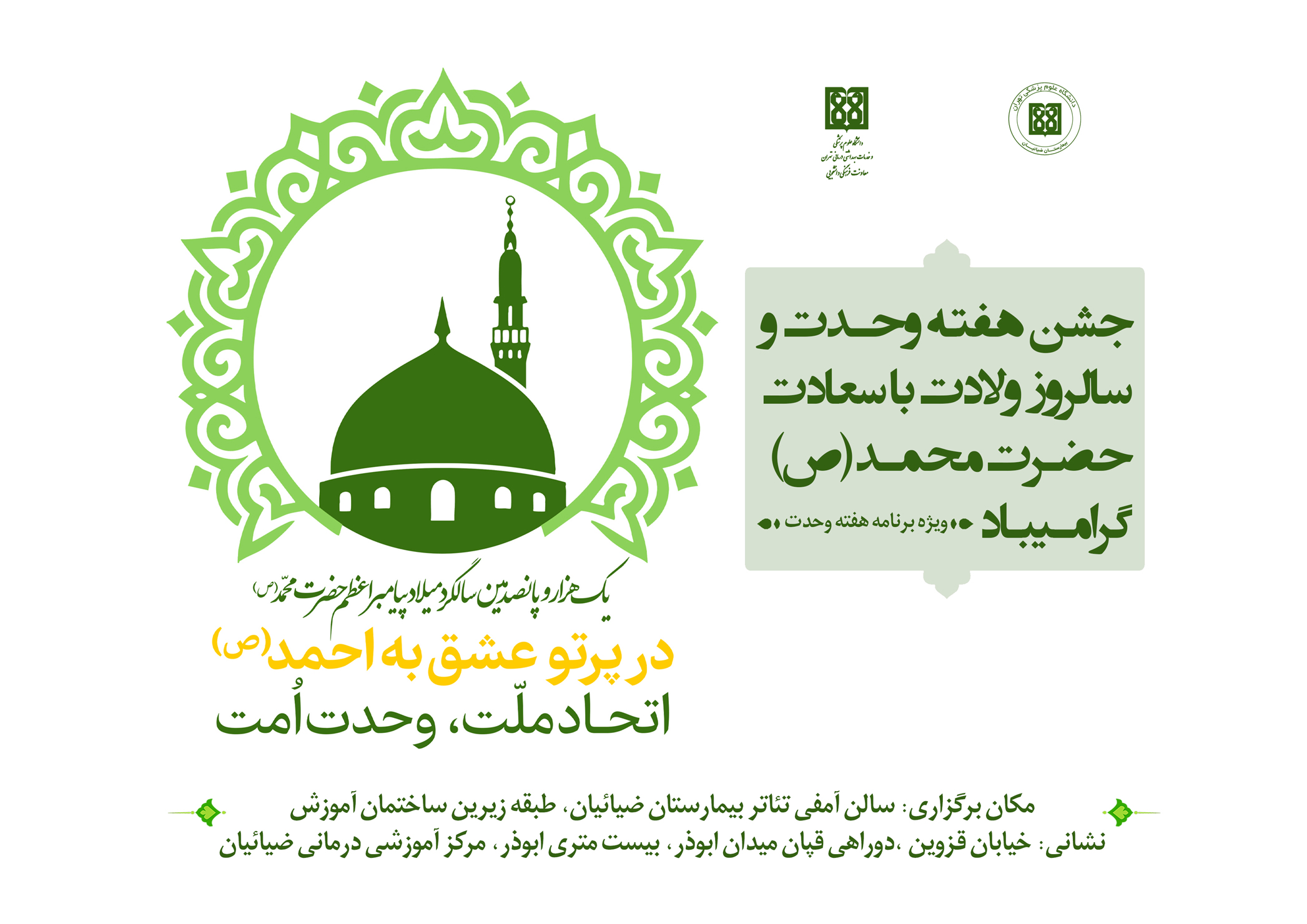به گزارش روابط عمومی معاونت فرهنگی و دانشجویی دانشگاه علوم پرشکی تهران؛ جشن «در پرتو عشق به احمد» به مناسبت سالروز میلاد مسعود پیامبر گرامی اسلام حضرت محمد مصطفی (ص) و مذهب تشیع حضرت امام جعفر صادق (ع)، همزمان با هفته مبارک وحدت، در بیمارستان ضیائیان برگزار میشود.