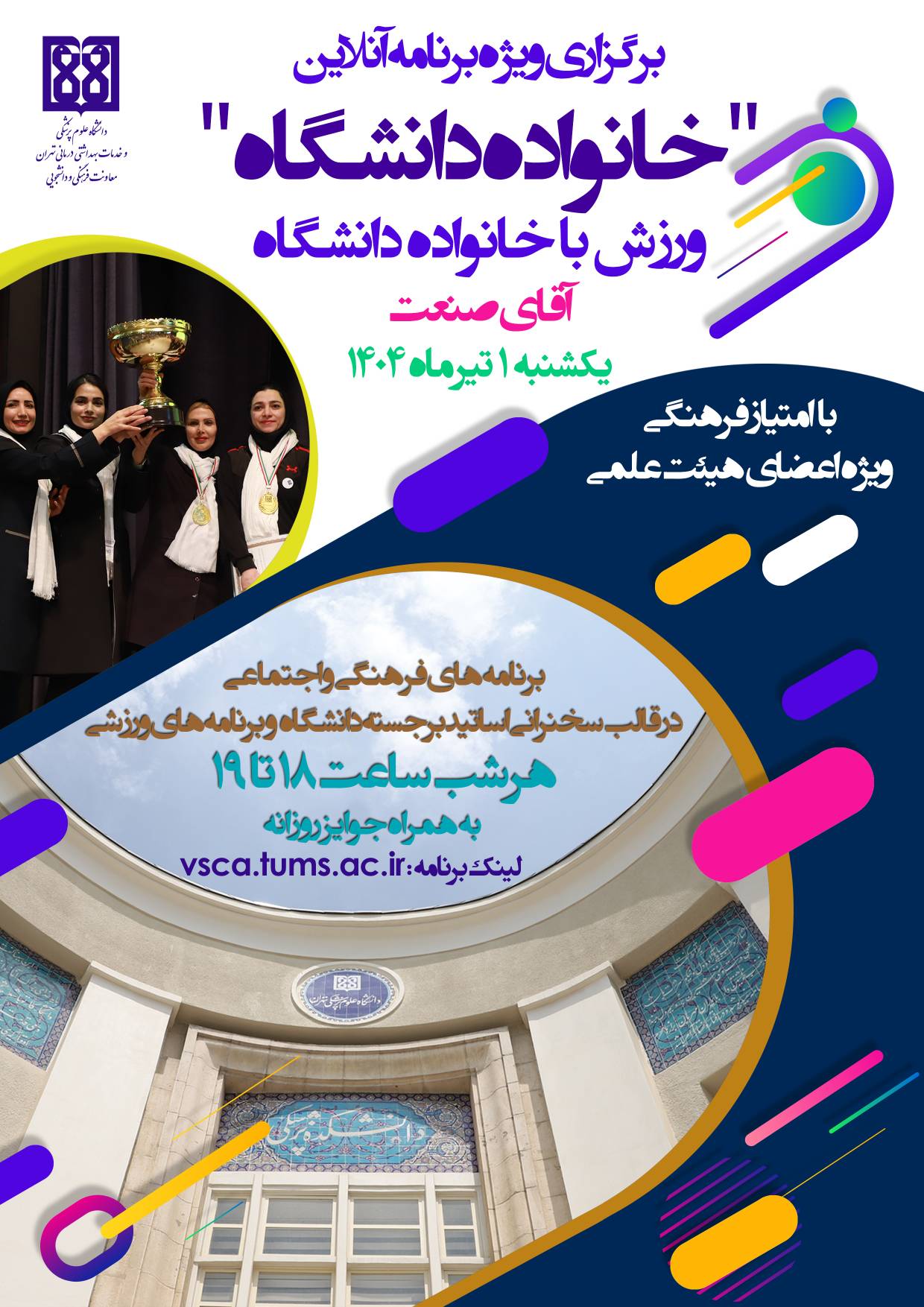به گزارش روابط عمومی معاونت فرهنگی و دانشجویی دانشگاه علوم پزشکی تهران؛ دومین ویژه برنامه آنلاین در قالب برنامه خانواده دانشگاه با موضوع ورزش با خانواده دانشگاه با سخنرانی آقای صنعت مربی بین المللی ورزشی، یکشنبه ۱ تیر ۱۴۰۴ از ساعت ۱۸ تا ۱۹ به همراه جوایز روزانه و امتیاز فرهنگی ویژه اعضای علمی دانشگاه برگزار میشود.