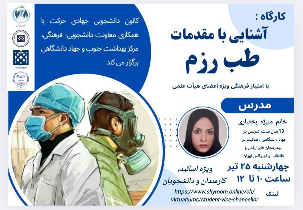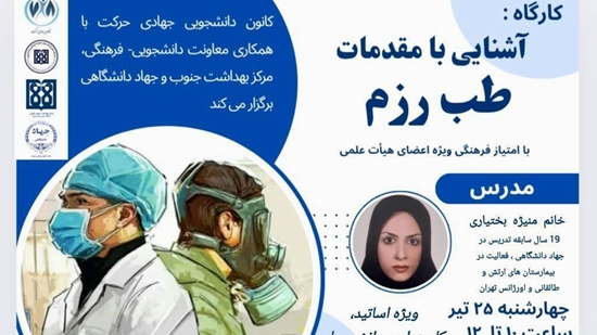 به همت کانون دانشجویی جهادی حرکت و با همکاری معاونت فرهنگی و دانشجویی، مرکز بهداشت و درمان جنوب و جهاد دانشگاهی، کارگاه آموزشی «آشنایی با مقدمات طب رزم» برگزار می‌شود.
