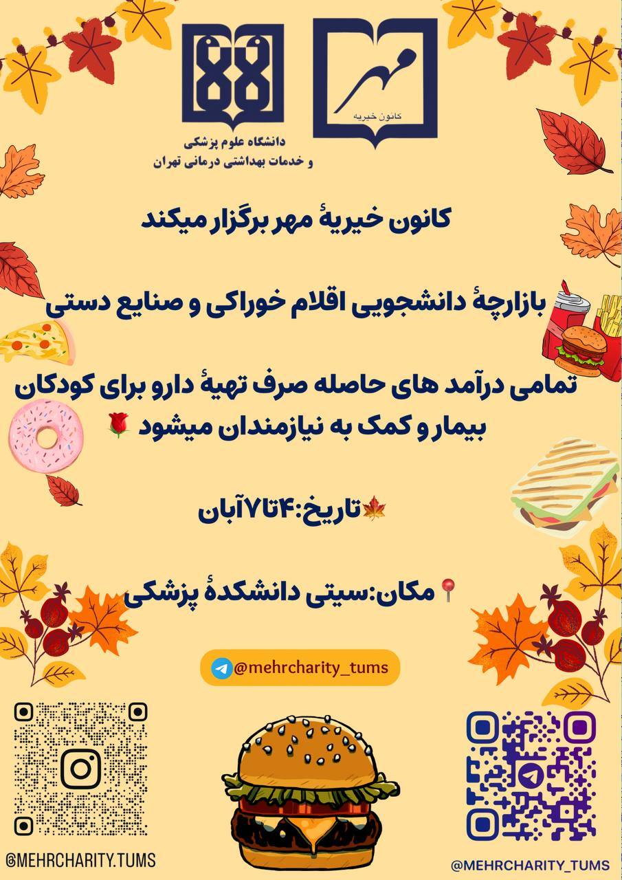 کانون دانشجویی مهر از تمامی دانشجویان، استادان و کارکنان دانشگاه دعوت می‌کند با حضور و خرید از غرفه‌های بازارچه، در این کار خیر سهیم باشند. همچنین علاقمندان به همکاری در پخت غذا یا فعالیت داوطلبانه از طریق این آیدی mehrcharity_tums@ با کانون تماس بگیرند.
