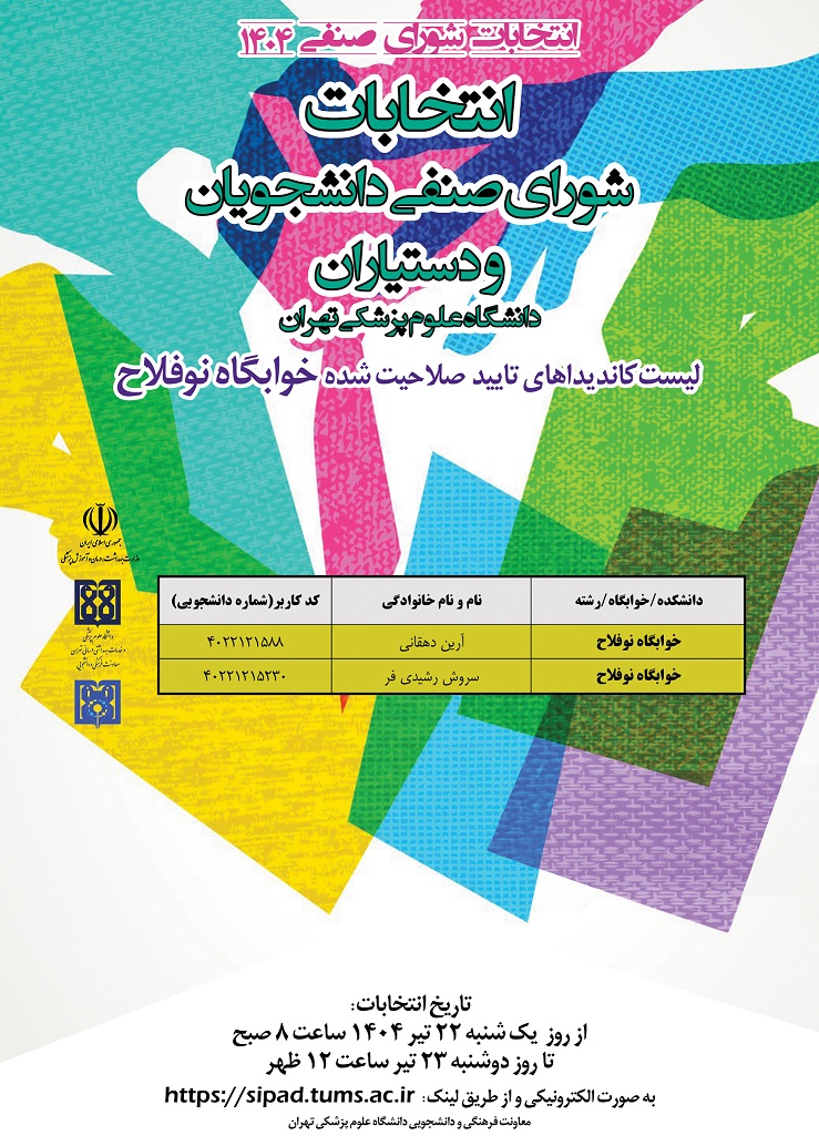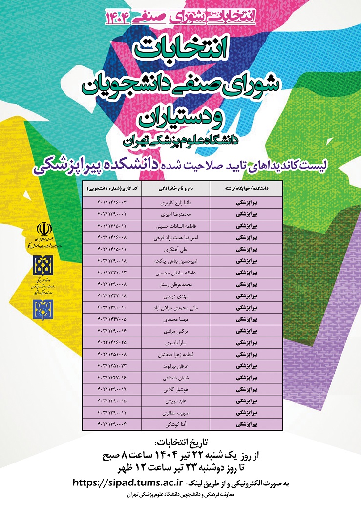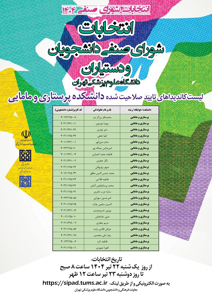 برای دریافت پوستر لیست کاندیداهای تایید صلاحیت شده دانشکده پرستاری و مامایی، اینجا کلیک کنید.