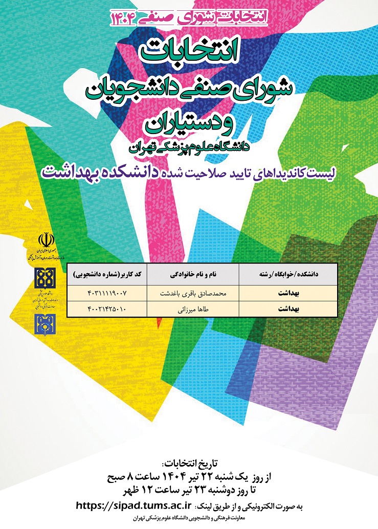 برای دریافت پوستر لیست کاندیداهای تایید صلاحیت شده دانشکده بهداشت، اینجا کلیک کنید.