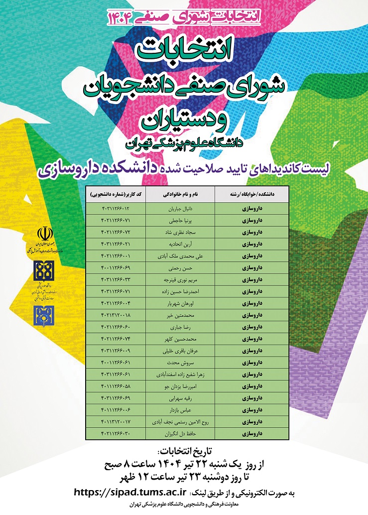 برای دریافت پوستر لیست کاندیداهای تایید صلاحیت شده دانشکده داروسازی، اینجا کلیک کنید.