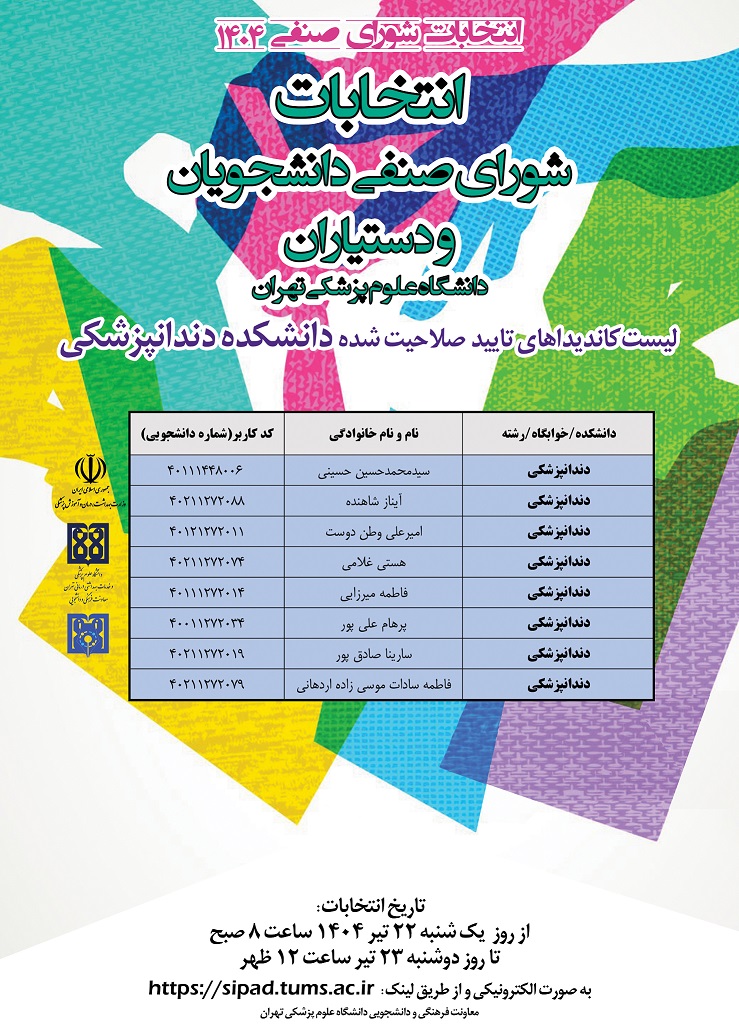 برای دریافت پوستر لیست کاندیداهای تایید صلاحیت شده دانشکده دندانپزشکی، اینجا کلیک کنید.