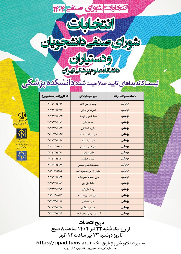 برای دریافت پوستر لیست کاندیداهای تایید صلاحیت شده دانشکده پزشکی، اینجا کلیک کنید.