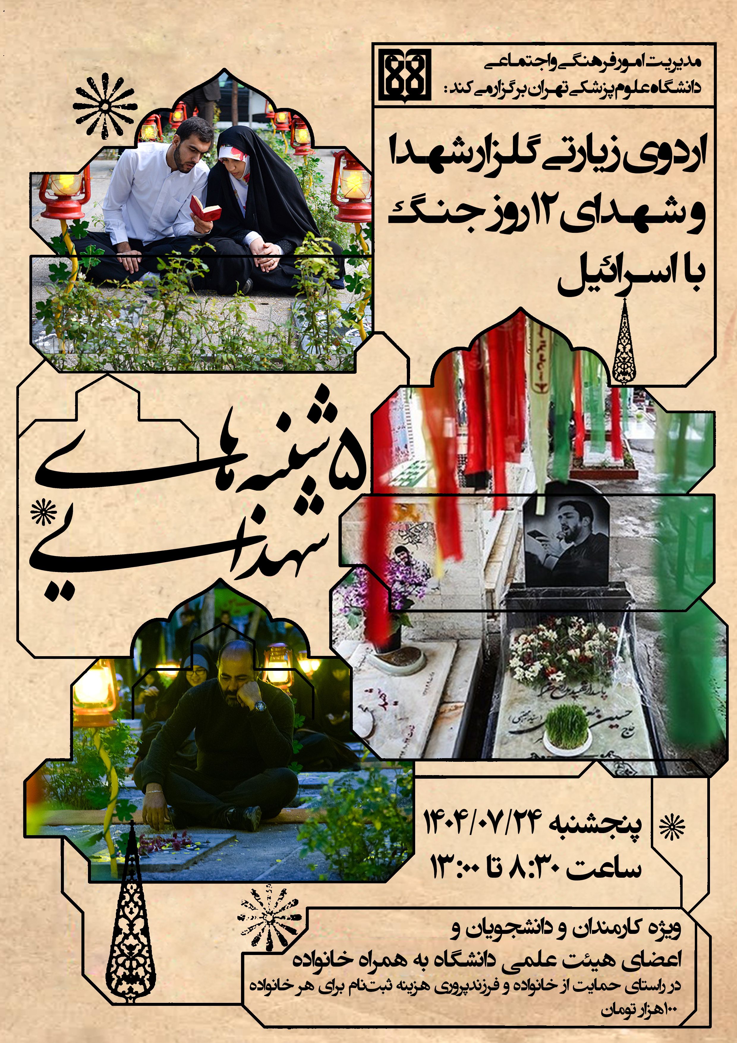به گزارش روابط عمومی معاونت فرهنگی و دانشجویی دانشگاه علوم پزشکی تهران، در راستای پاسداشت یاد و خاطره شهدای دفاع مقدس و حمایت از خانوادههای دانشگاهیان، اردوی زیارتی گلزار شهدای دفاع مقدس و شهدای ۱۲ روز جنگ، پنجشنبه ۲۴ مهرماه از ساعت ۸:۳۰ تا ۱۳ برگزار خواهد شد.