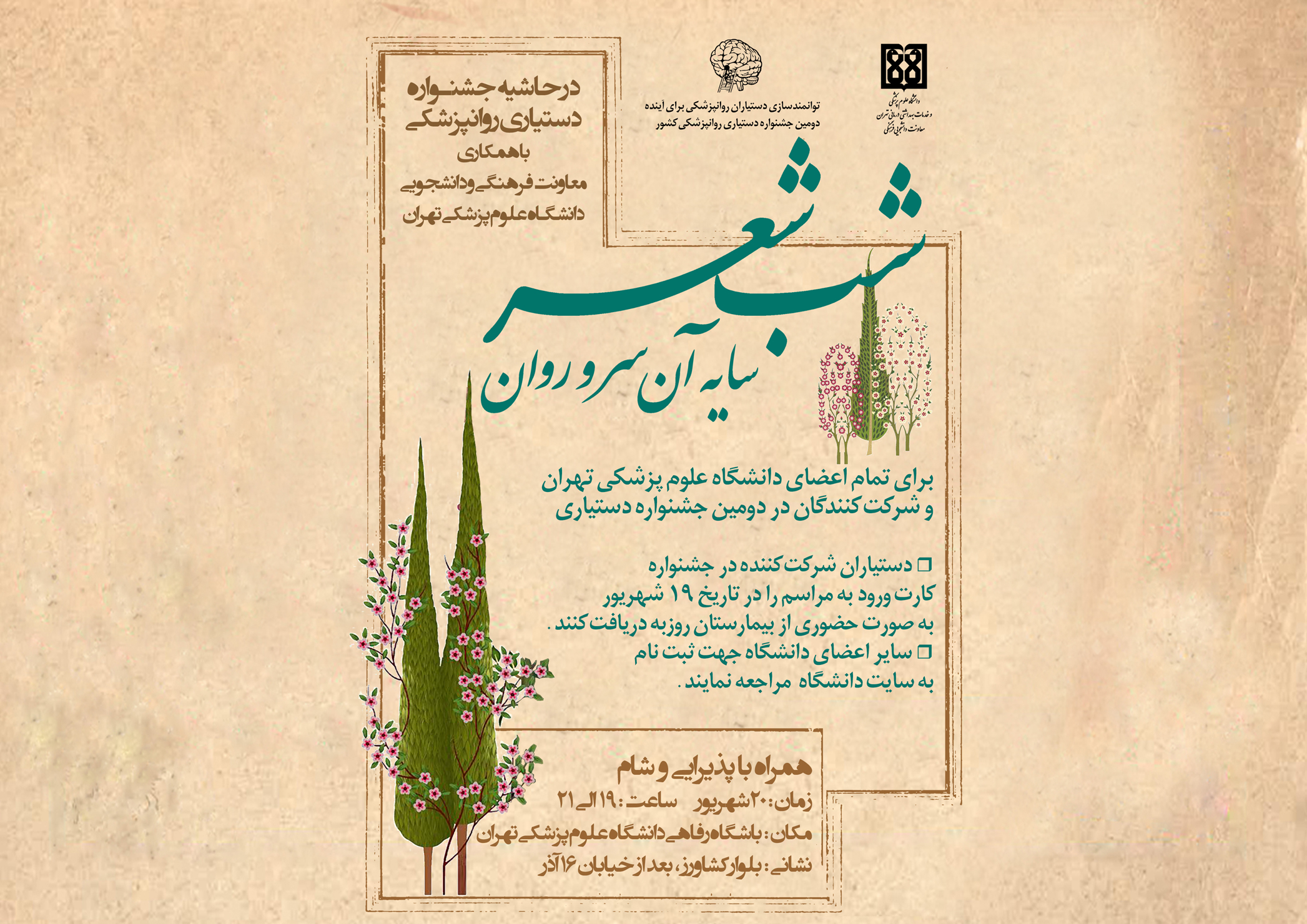 معاونت فرهنگی و دانشجویی دانشگاه علوم پزشکی تهران در حاشیه دومین جشنواره دستیاری روانپزشکی، ویژهبرنامه شب شعر «سایه آن سرو روان» با حضور اعضای دانشگاه و شرکتکنندگان جشنواره برگزار میکند.