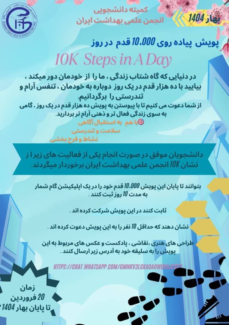 کمیته دانشجویی انجمن علمی بهداشت ایران در بهار ۱۴۰۴ با هدف ارتقاء سلامت جسم و روان و ترویج فعالیت بدنی، پویش «دههزار قدم در یک روز» را برگزار کرد. این پویش با رویکردی آگاهانه به زندگی سالم، دانشجویان و علاقهمندان را به مشارکت در گامی ساده اما مؤثر برای بهبود سبک زندگی دعوت کرده است.
