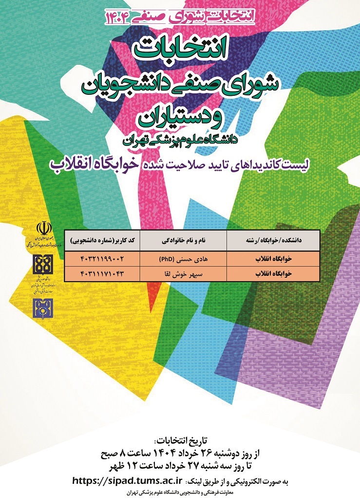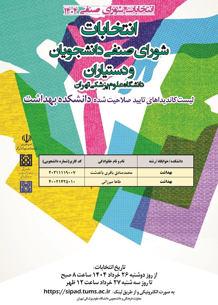 برای دریافت پوستر لیست کاندیداهای تایید صلاحیت شده دانشکده بهداشت، اینجا کلیک کنید.