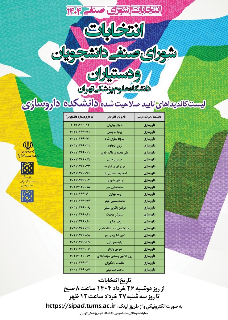 برای دریافت پوستر لیست کاندیداهای تایید صلاحیت شده دانشکده داروسازی، اینجا کلیک کنید.