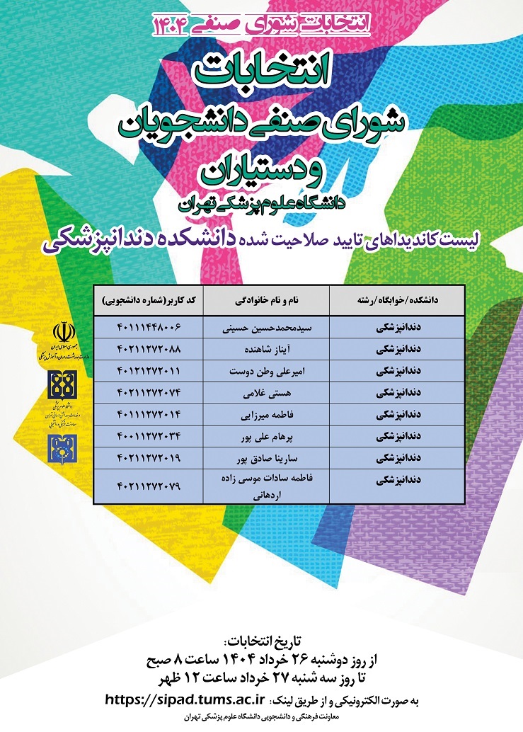 برای دریافت پوستر لیست کاندیداهای تایید صلاحیت شده دانشکده دندانپزشکی، اینجا کلیک کنید.