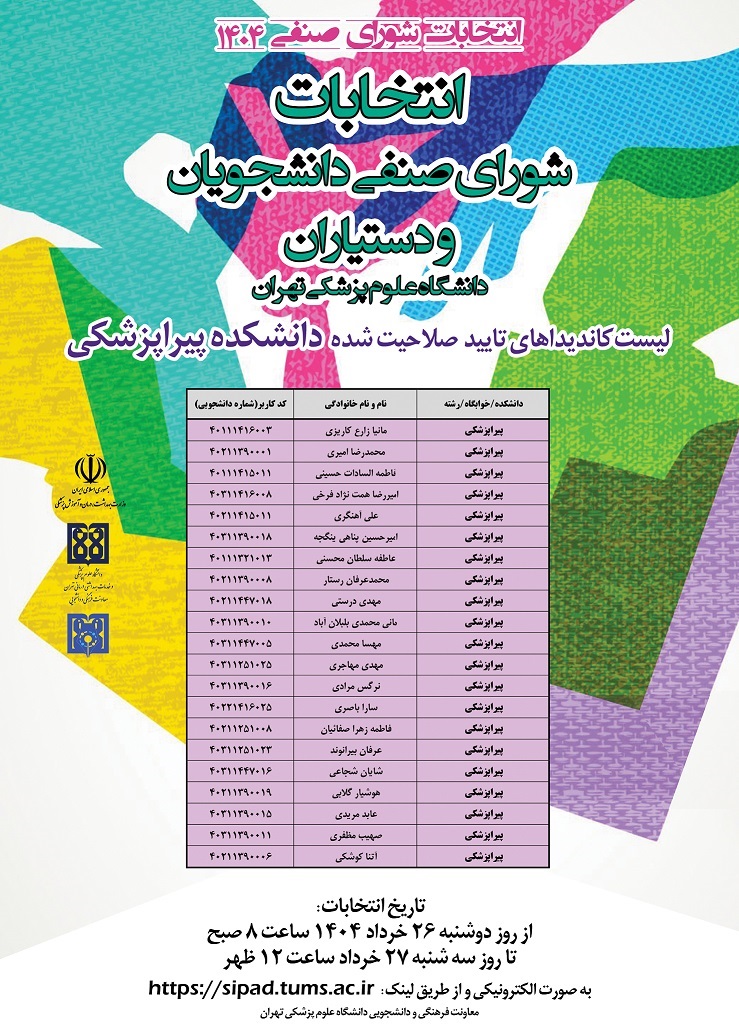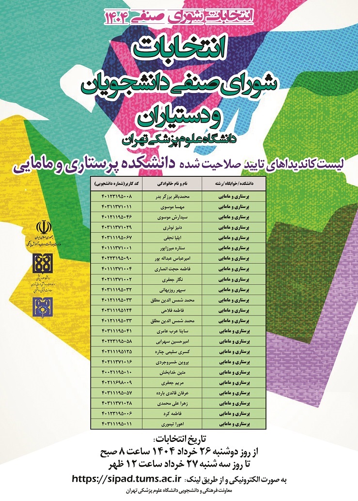 برای دریافت پوستر لیست کاندیداهای تایید صلاحیت شده دانشکده پرستاری و مامایی، اینجا کلیک کنید.