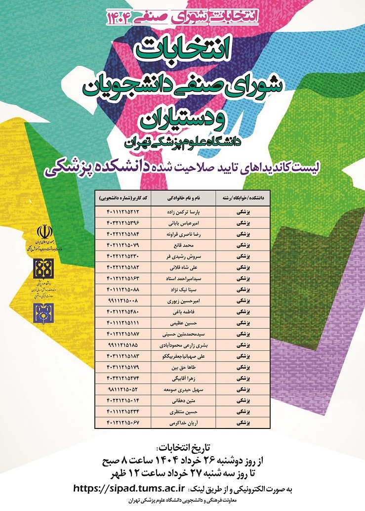 برای دریافت پوستر لیست کاندیداهای تایید صلاحیت شده دانشکده پزشکی، اینجا کلیک کنید.
