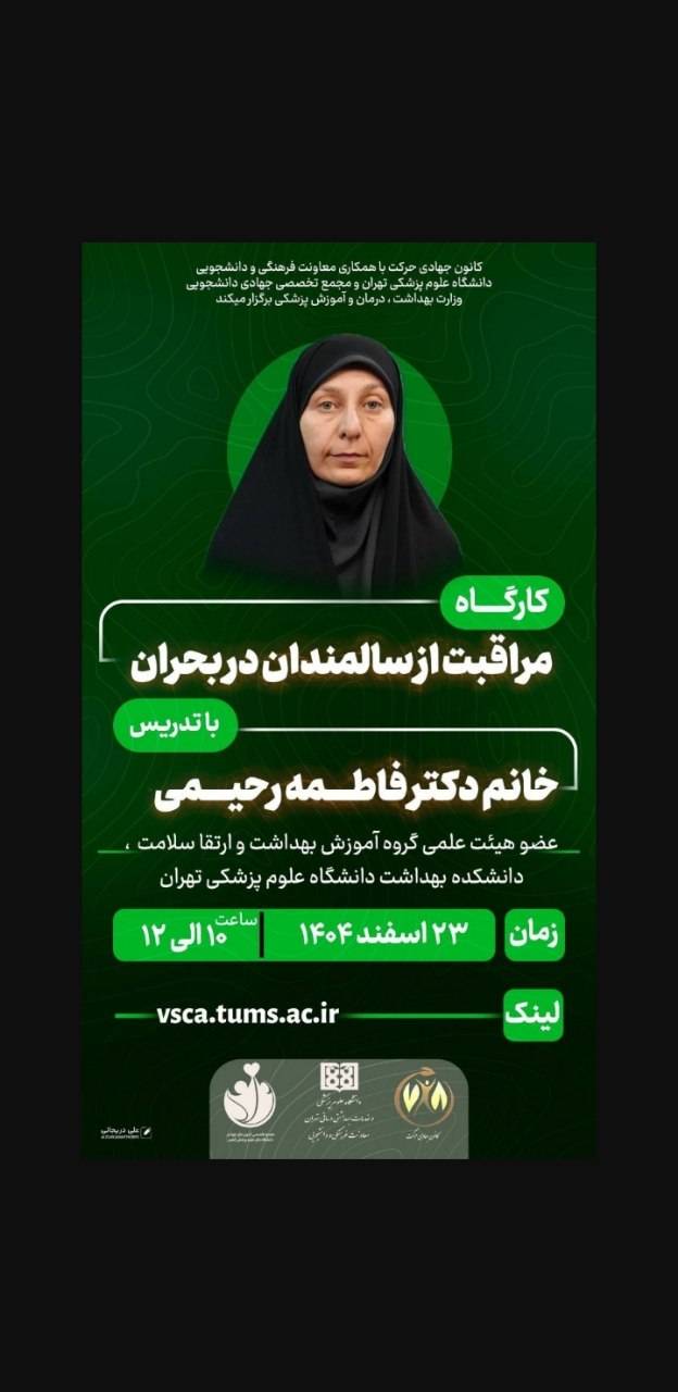 کانون جهادی دانشجویی حرکت با همکاری معاونت فرهنگی و دانشجویی دانشگاه علوم پزشکی تهران، کارگاه آموزشی مراقبت از سالمندان در بحران را با تدریس دکتر فاطمه رحیمی برگزار می‌کند. این کارگاه به منظور ارتقای آگاهی دانشجویان در ارائه خدمات بهداشتی به سالمندان برگزار خواهد شد.