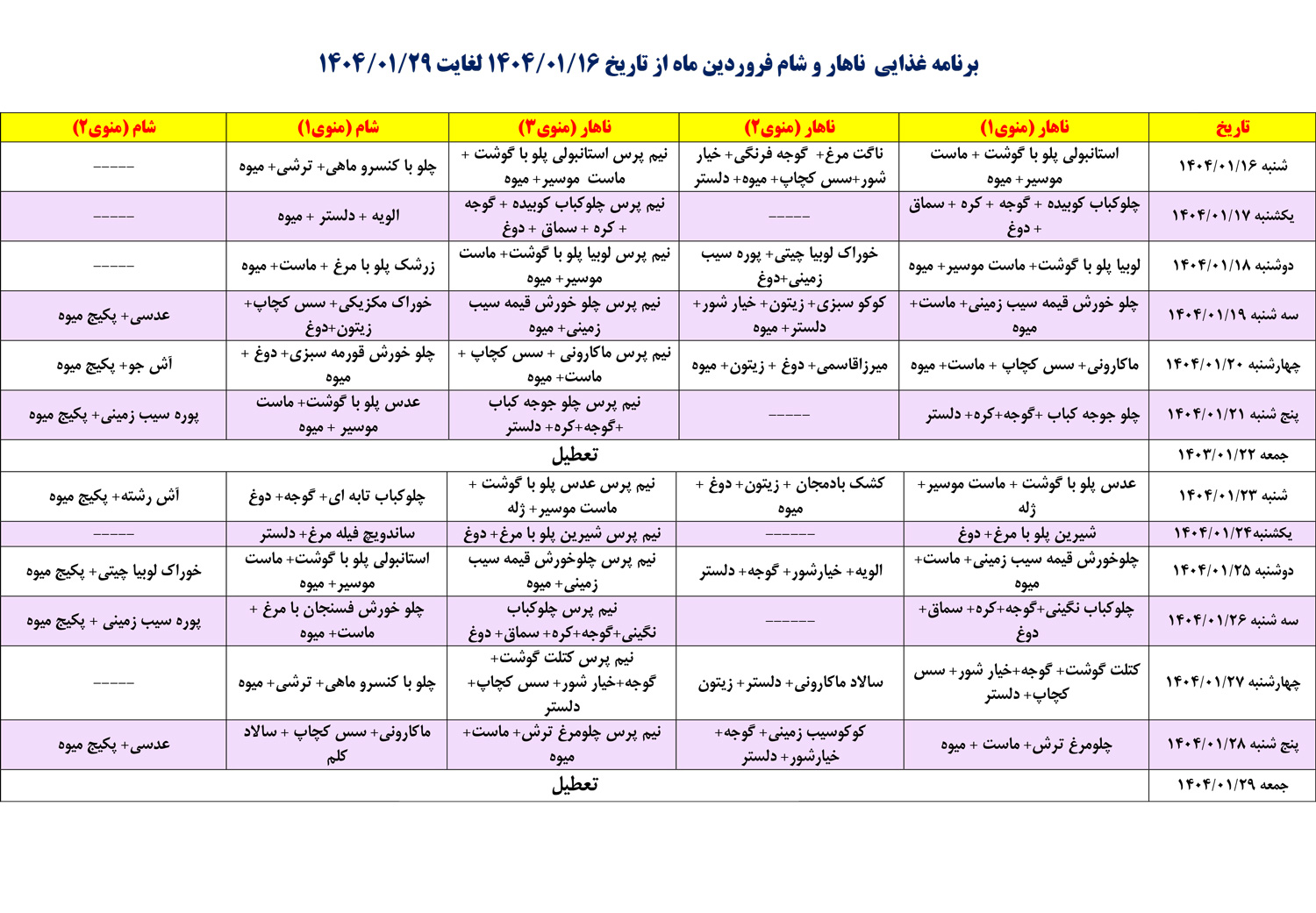 برنامه غذایی ناهار و شام دانشجویی از 16 فروردین ماه تا 29 فروردین ماه 1404 از سوی اداره تغذیه دانشجویان اعلام شد