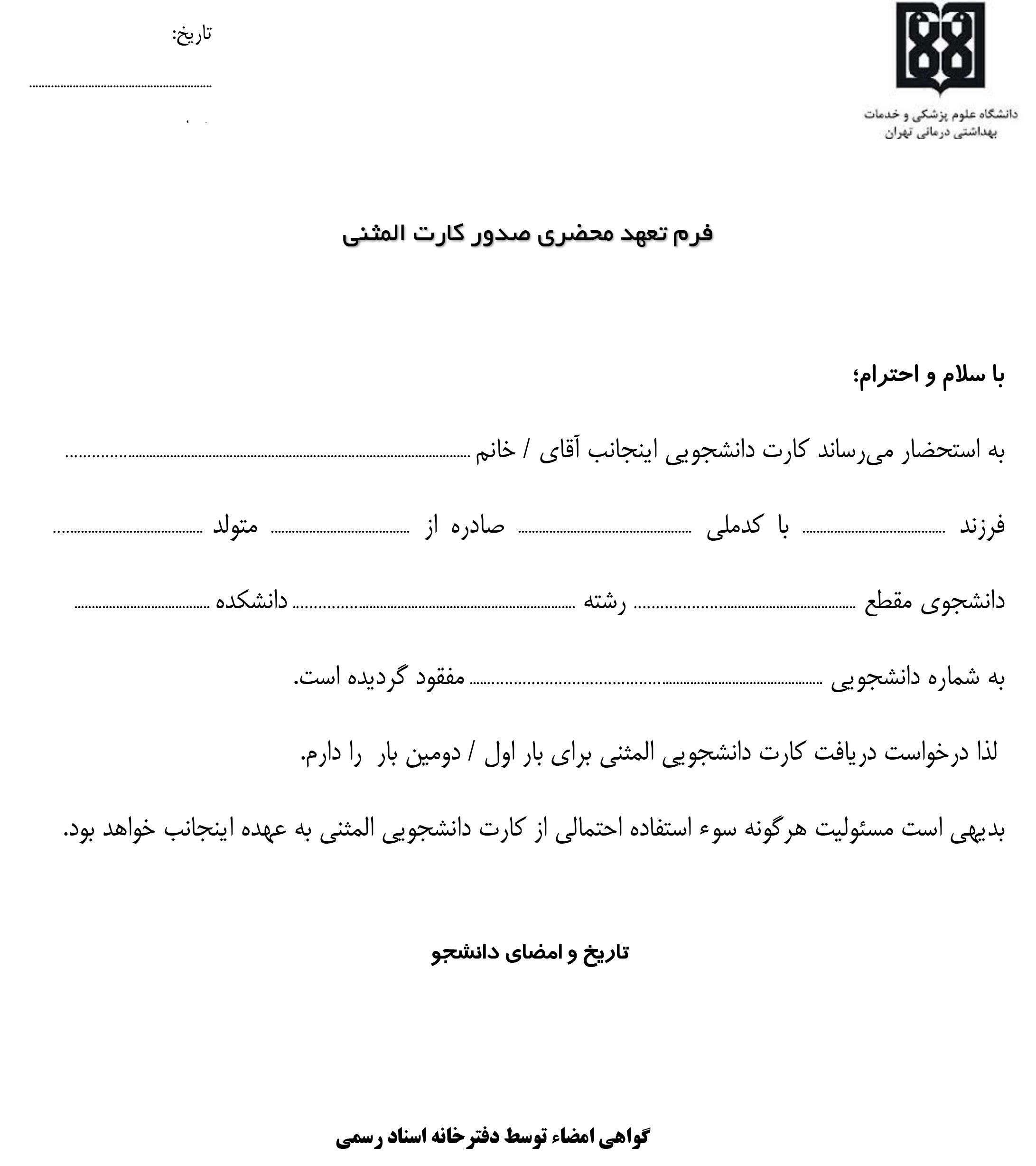 در صورت درخواست کارت المثنی به دلیل مفقودی یا شکستگی و خرابی کارت، لطفاً با مراجعه به پروفایل خود از قسمت مکاتبات اداری، فرم های درخواست، برای کارت شناسایی درخواست ثبت کنید و مراحل خواسته شده در سامانه را از نظر مفقودی یا شکستگی و یا مرتبه المثنی دنبال نمایید.