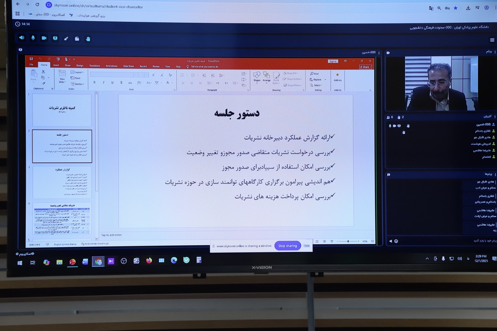 به گزارش روابط عمومی معاونت فرهنگی و دانشجویی دانشگاه علوم پزشکی تهران، دومین جلسه  صدور مجوز های کمیته ناظر بر نشریات دانشگاه در سال ۱۴۰۴، دوشنبه 10 آذر از ساعت 14 تا 15 در بستر اسکای روم معاونت فرهنگی و دانشجویی برگزار شد.