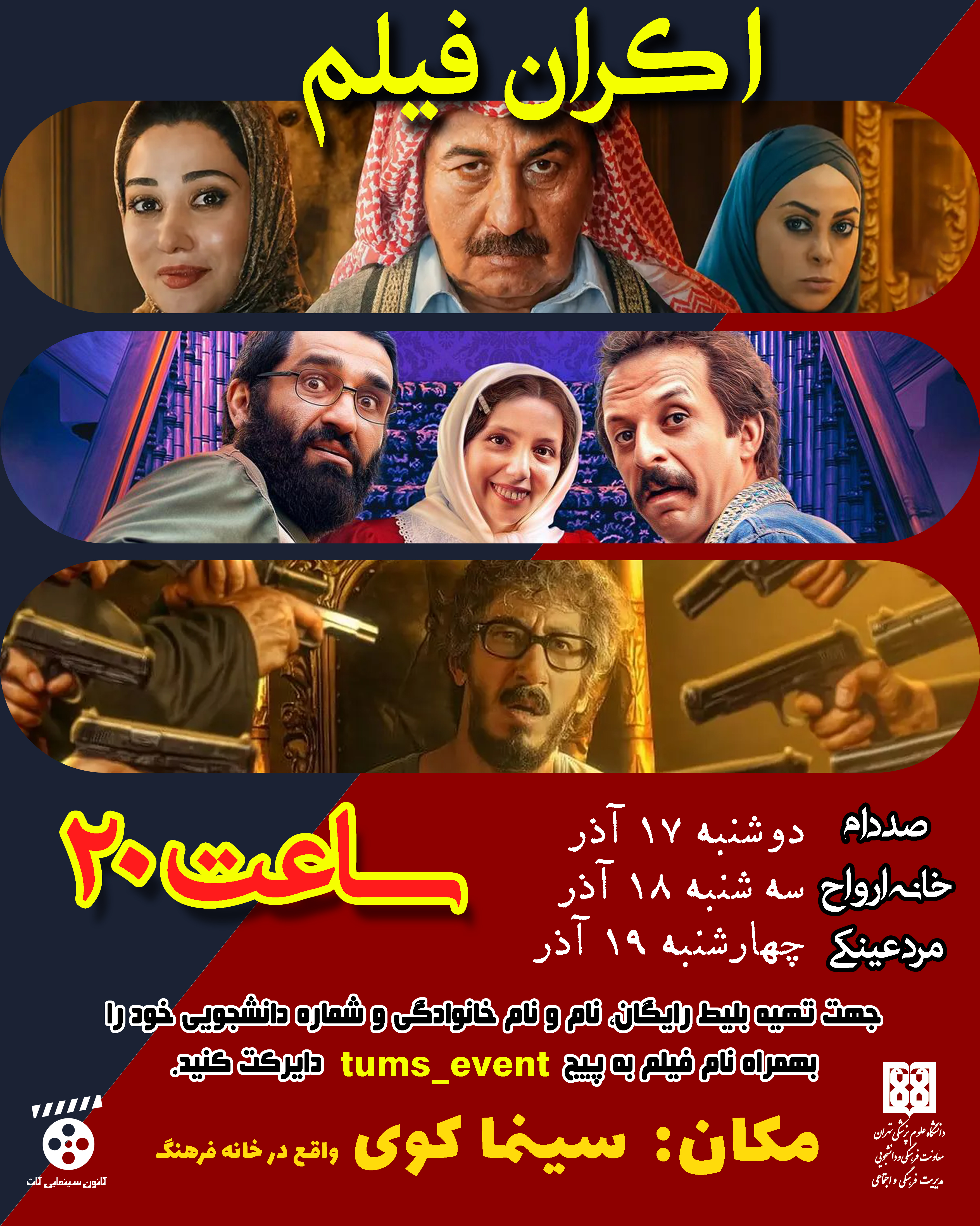 به گزارش روابط عمومی معاونت فرهنگی و دانشجویی دانشگاه علوم پزشکی تهران، در راستای ایجاد فضایی شاداب و غنیسازی اوقات فراغت، سه فیلم سینمایی کمدی منتخب توسط مدیریت امور فرهنگی و اجتماعی و با همکاری کانون سینمایی کات در روزهای دوشنبه 17 آذر فیلم «صدام»، سه شنبه 18 آذر «خانه ارواح» و چهارشنبه 19 آذر «مرد عینکی» رأس ساعت ۲۰ در سالن سینما کوی، واقع در خانه فرهنگ اکران می شود.