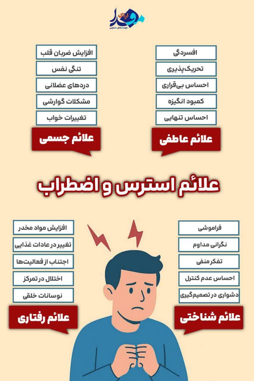 اینفوگرافی علائم استرس و اضطراب با محور علائم جسمی، عاطفی، رفتاری و شناختی منتشر شد.