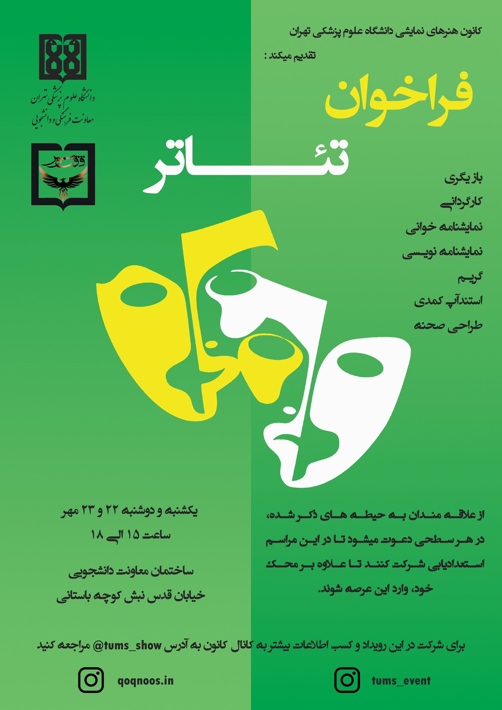 کانون هنر های نمایشی دانشجویی ققنوس دانشگاه علوم پزشکی تهران با همکاری مدیریت امور فرهنگی و اجتماعی دانشگاه در حیطه تئاتر عضو جدید می پذیرد.