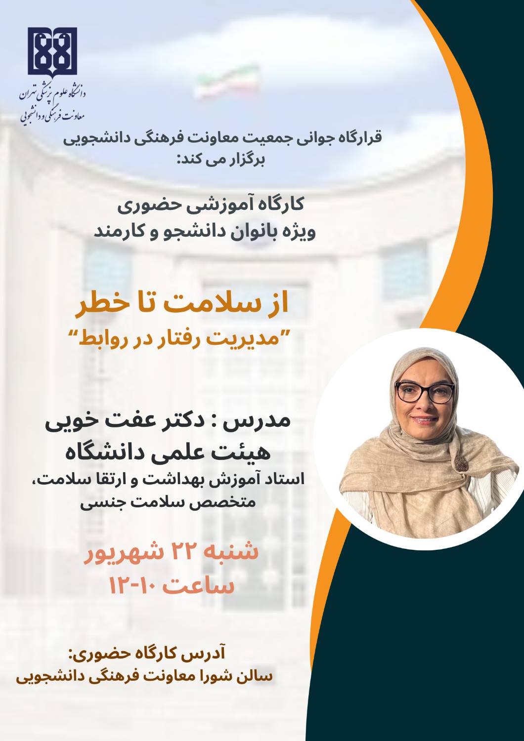 با هدف ارتقای مهارتهای رفتاری بانوان در حوزه سلامت فردی و اجتماعی، دانشگاه علوم پزشکی تهران کارگاه آموزشی «از سلامت تا خطر» را با محوریت مدیریت رفتار در روابط برگزار میکند؛ فرصتی برای یادگیری راهکارهای علمی پیشگیری از آسیبهای روانی و اجتماعی در روابط بینفردی.