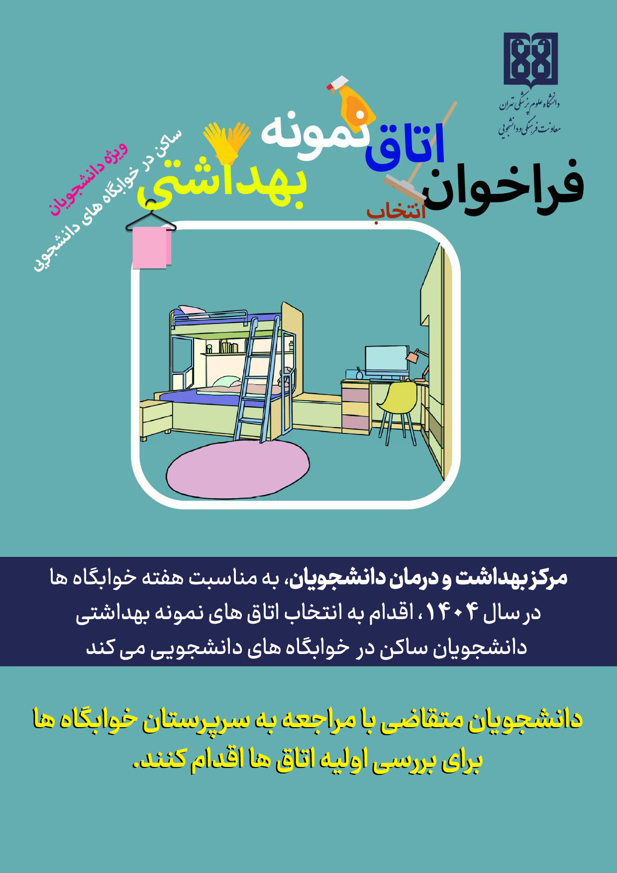مرکز بهداشت و درمان دانشجویان دانشگاه علوم پزشکی تهران، در راستای ارتقای فرهنگ بهداشت محیطی، طرح انتخاب اتاقهای نمونه بهداشتی را در هفته خوابگاهها برگزار میکند.