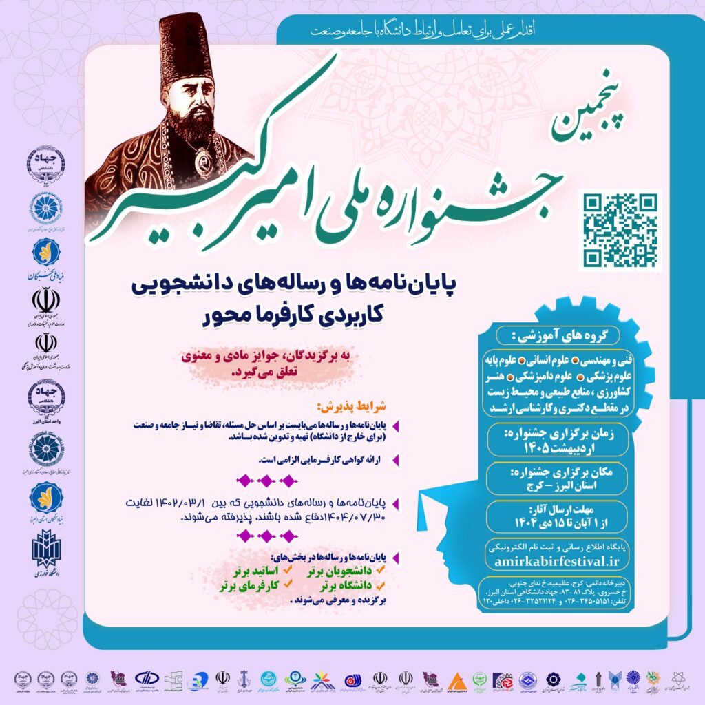 به گزارش روابط عمومی معاونت فرهنگی و دانشجویی دانشگاه علوم پزشکی تهران، یکی از بسترهایی که می‌تواند در شکل ‌دهی ارتباط دانشگاه با صنعت و جامعه موثر واقع شود، ظرفیت پایان نامه ها و رساله های دانشجویی است. در این راستا پنجمین جشنواره ملی امیرکبیر ویژه دانشجویان مقاطع کارشناسی ارشد و دکترا که پایان نامه یا رساله ی دانشجویی خود را بین 30 مهر 1402 تا 30 مهر 1404 دفاع کرده باشند برگزار می شود.