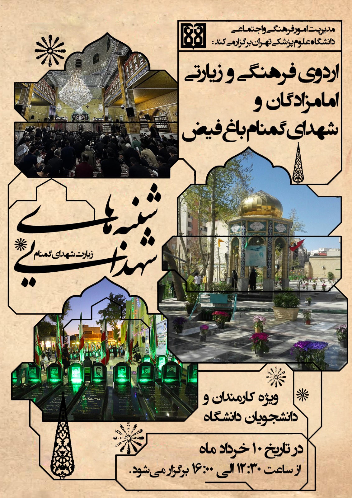 در راستای استمرار فعالیتهای مدیریت فرهنگی و اجتماعی دانشگاه علوم پزشکی تهران و بهمنظور پاسداشت مقام والای شهدا و ترویج فرهنگ ایثار و شهادت، ویژهبرنامه «شنبههای شهدایی» در خردادماه ۱۴۰۴ با رویکردی متفاوت و متناسب با فضای معنوی این ایام، در قالب بازدیدی زیارتی از مقبره امام زاده باغ فیض تهران برگزار میشود.