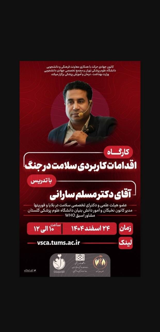 به گزارش روابط ‌عمومی معاونت فرهنگی و دانشجویی دانشگاه علوم پزشکی تهران، کانون جهادی دانشجویی حرکت با همکاری معاونت فرهنگی و دانشجویی دانشگاه علوم پزشکی تهران و مجمع تخصصی جهادی دانشجویی وزارت بهداشت، درمان و آموزش پزشکی، کارگاه آموزشی «اقدامات کاربردی سلامت در جنگ» را برگزار می‌کند.