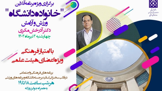 به گزارش روابط عمومی معاونت فرهنگی و دانشجویی دانشگاه علوم پزشکی تهران؛ پنجمین ویژه برنامه آنلاین در قالب برنامه خانواده دانشگاه با موضوع سلسله جلسات توسعه فردی دکتر آذرخش مکری، عضو هیئت علمی دانشگاه علوم پزشکی تهران، چهارشنبه ۴ تیر ۱۴۰۴ از ساعت ۱۸ تا ۱۹ به همراه اهدای جایزه به صورت قرعه کشی برگزار می‌شود.