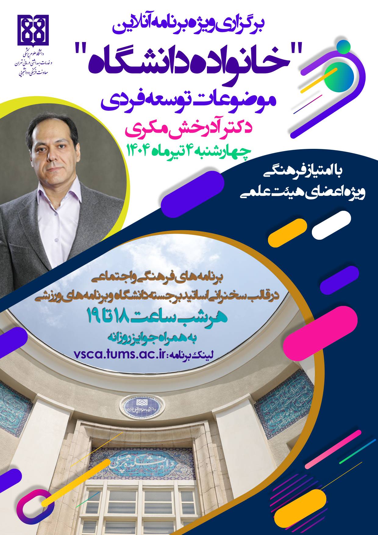 معاونت فرهنگی و دانشجویی دانشگاه علوم پزشکی تهران | پنجمین ویژه برنامه آنلاین خانواده دانشگاه با موضوع توسعه فردی دکتر آذرخش مکری
