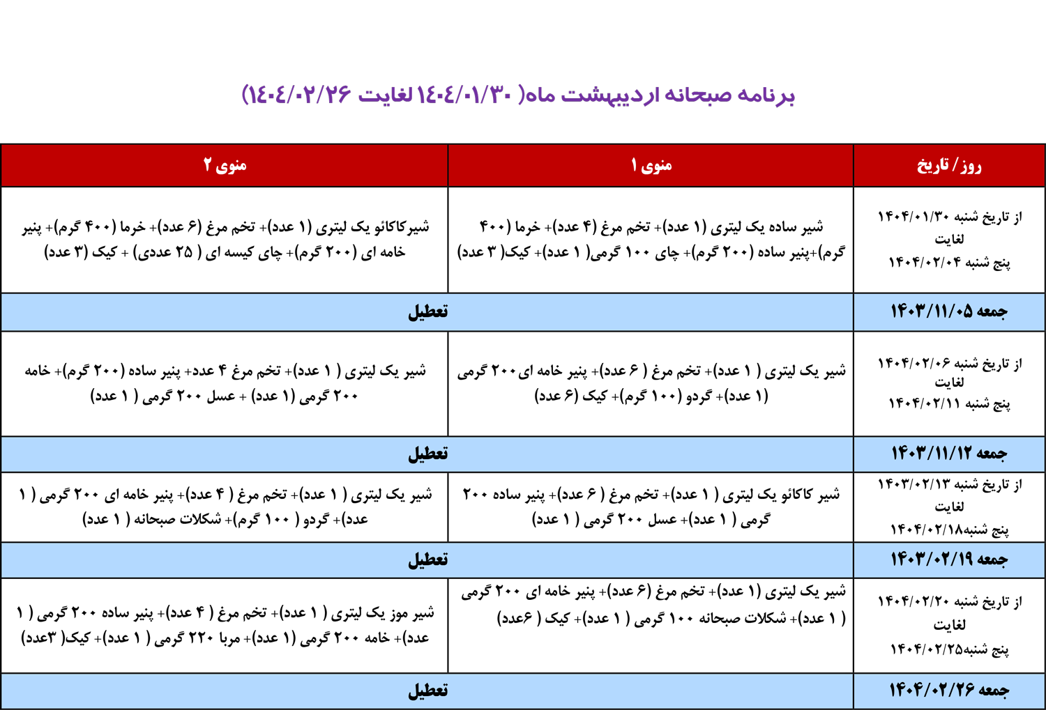برنامه غذایی صبحانه دانشجویی در اردیبهشت ماه 1404 اعلام شد